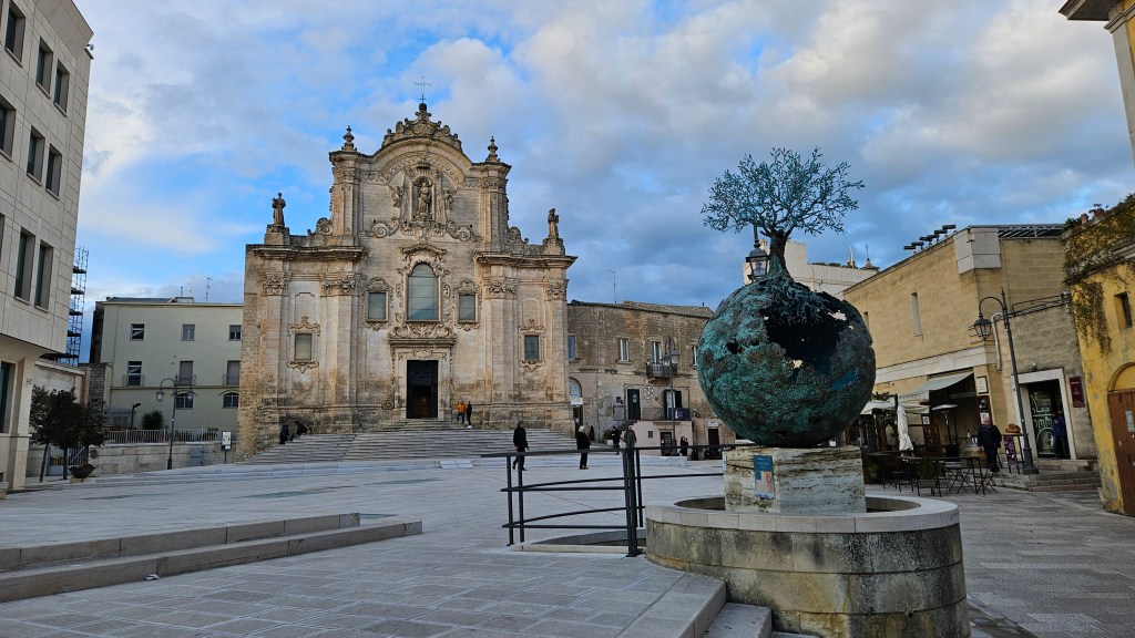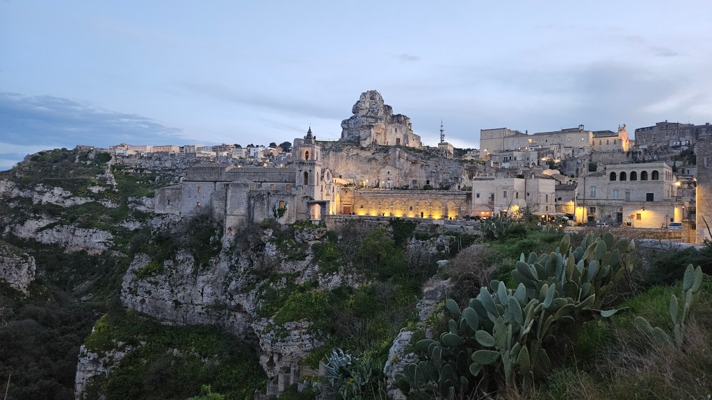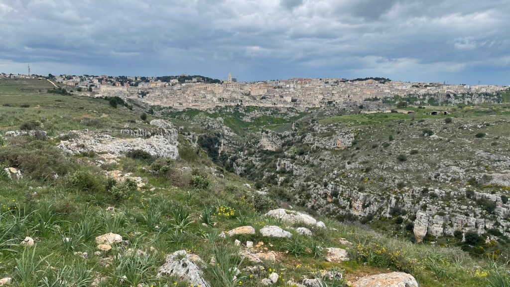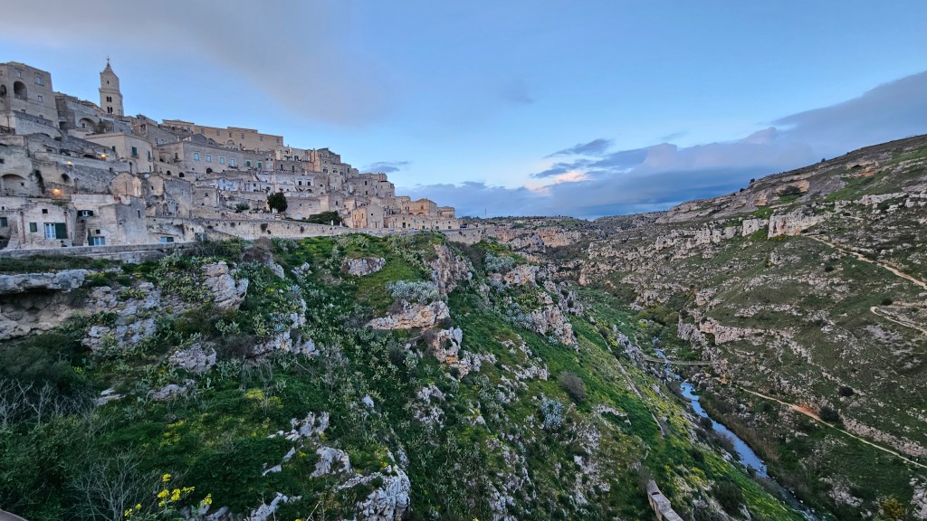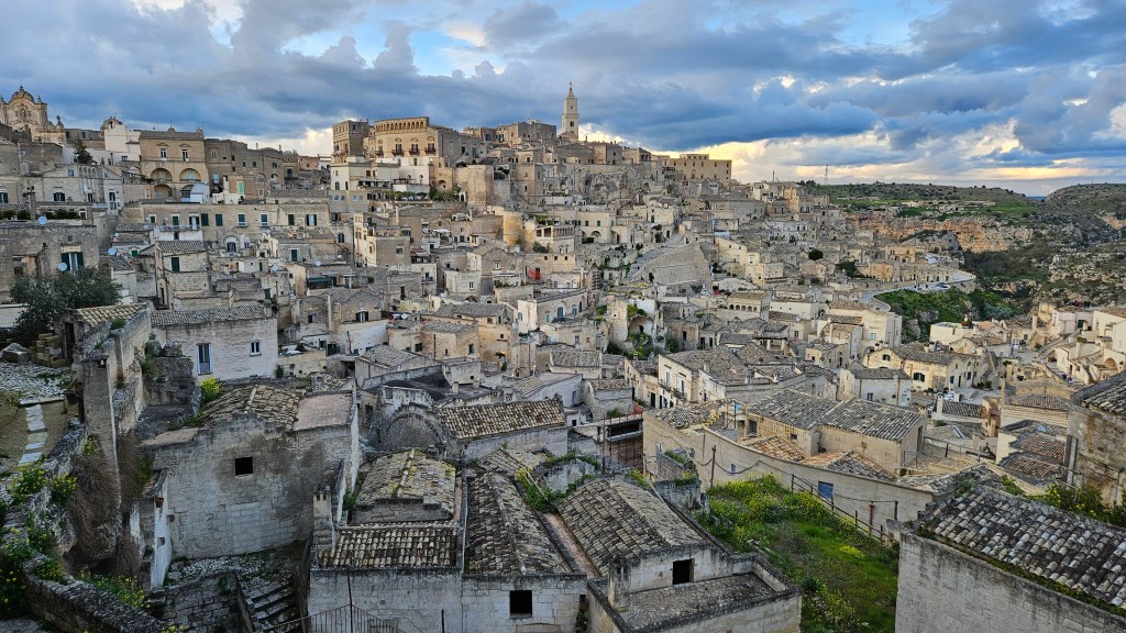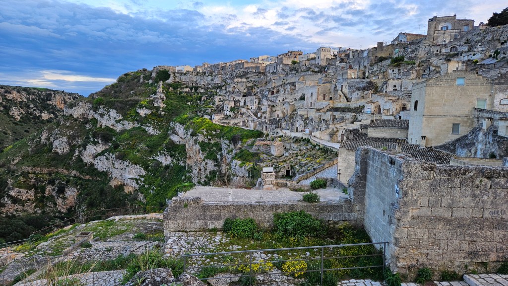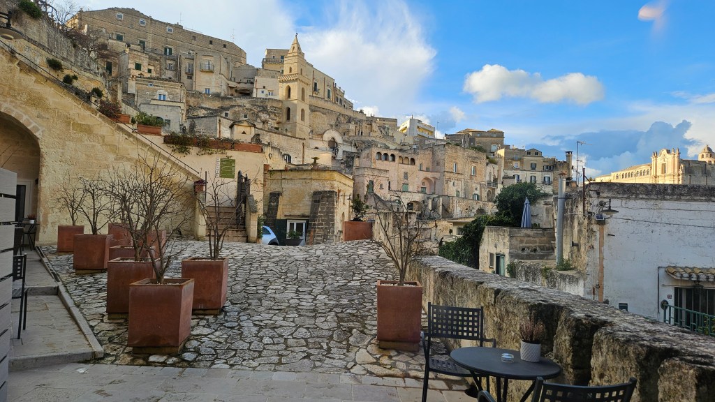 From the Bari Airport, the drive to Matera started with a drenching rain in some areas along the way. Just the week before, we read about Matera getting flooded by torrential rains. So, we kept our fingers crossed about our sojourn at Matera and didn’t have much hopes. As we drove closer to Matera the glistening rays of sun peeking from the clouds gave us some hope! The Fra I Sassi Residence hotel is in a ‘ZTL (Zona a Traffico Limitato)’ zone where only cars with certain permits can enter. It is to protect the historic Matera, a UNESCO world heritage site from traffic jams. Luckily we found a spot for free parking in via San Stefano, not far from where the ZTL begins. The walk down the cobble-stone roads was a bit tiring, but this faded away once the beautiful view of Matera unfolded in front of us. Overcast skies with soft sunlight filtering through clouds upped Matera’s beauty.