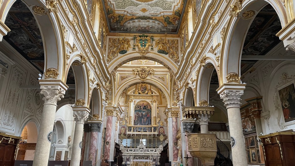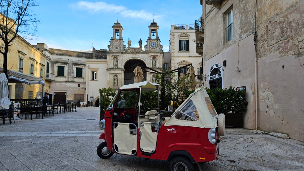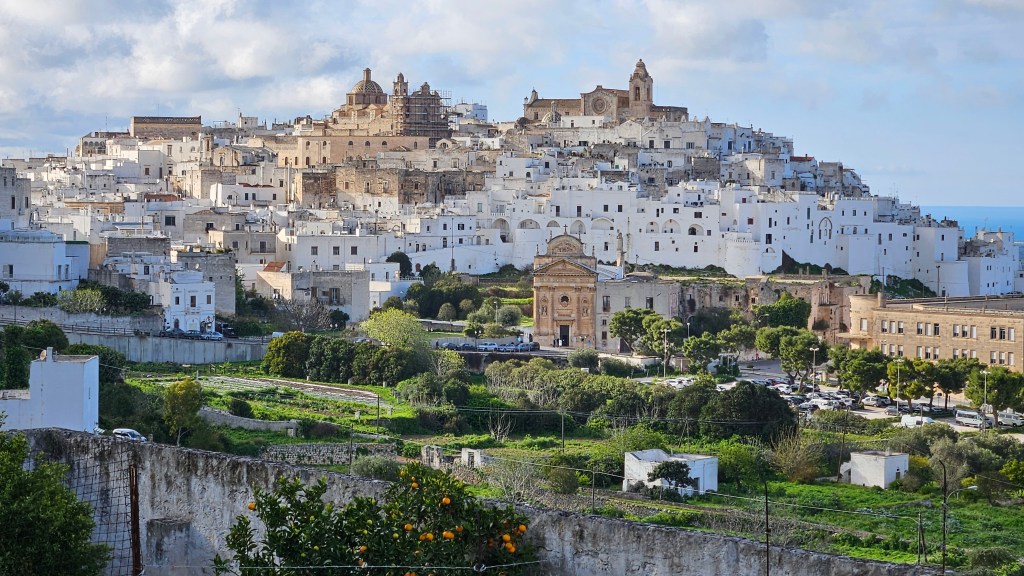 Next, we drove to Ostuni, a hilltop town known for its whitewashed buildings behind fortified walls. The drive was lined with Olive trees, some of them a few hundred years old. Strolling into the town with narrow streets winding up and down the hill filled with houses/buildings was a cool experience. One of the so-called “Instagram-famous” colorful doors didn’t quite live up to the hype, but the Duomo di Santa Maria and nearby gelato stop made up for it. On the way out of the city, we ventured into the newer part of the town on top of the nearby hill that provided a panoramic view of iconic fortified city of Ostuni.