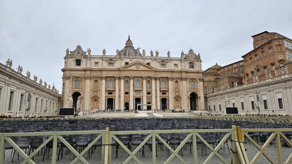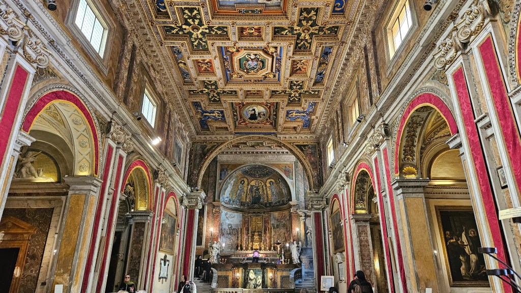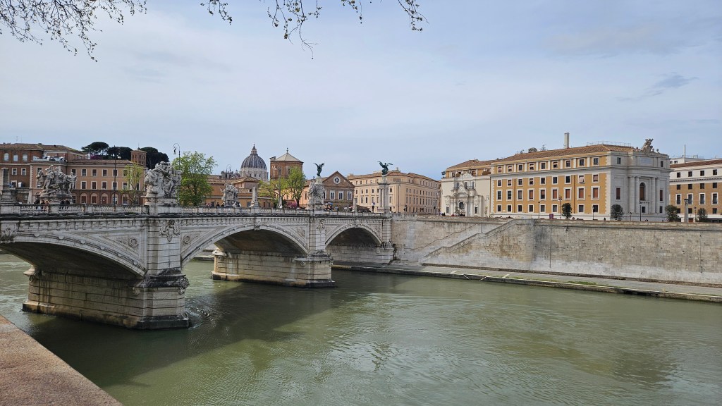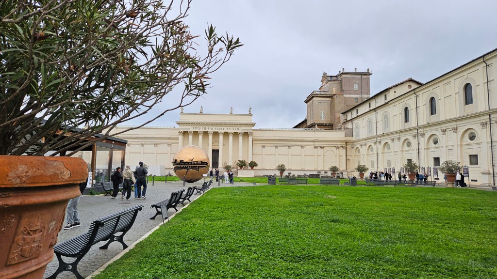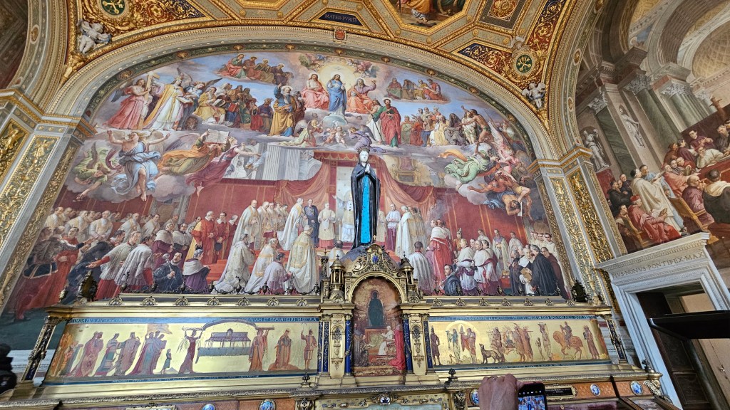 The Vatican Museum was about 30min walk from our hotel. Our pre-booked tour at 8:15AM was such a good idea, especially when we saw queues lined up winding down the street. The enormous collection of artworks – sculptures and paintings – was overwhelming. Michelangelo and Raffaelo dominated the styles of most art pieces there. Rick Steves YouTube videos would be more apt than the novice explanations that I can give here. Amidst the enormous crowd, the guided tour with earpiece helped us navigate efficiently within a few hours. Otherwise, even a few days may not be sufficient to explore the museum. The guided tour ended at the entrance of the Sistine Chapel where silence is requested and photography is forbidden. With the amount of crowd there, it was hardly silent, but at least people respected the ‘No Photography’ rule.