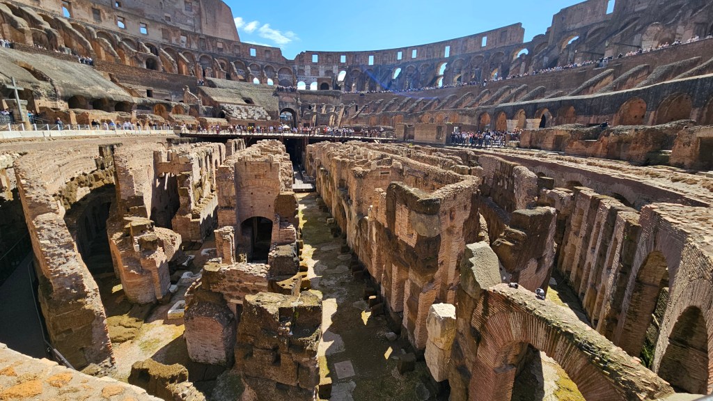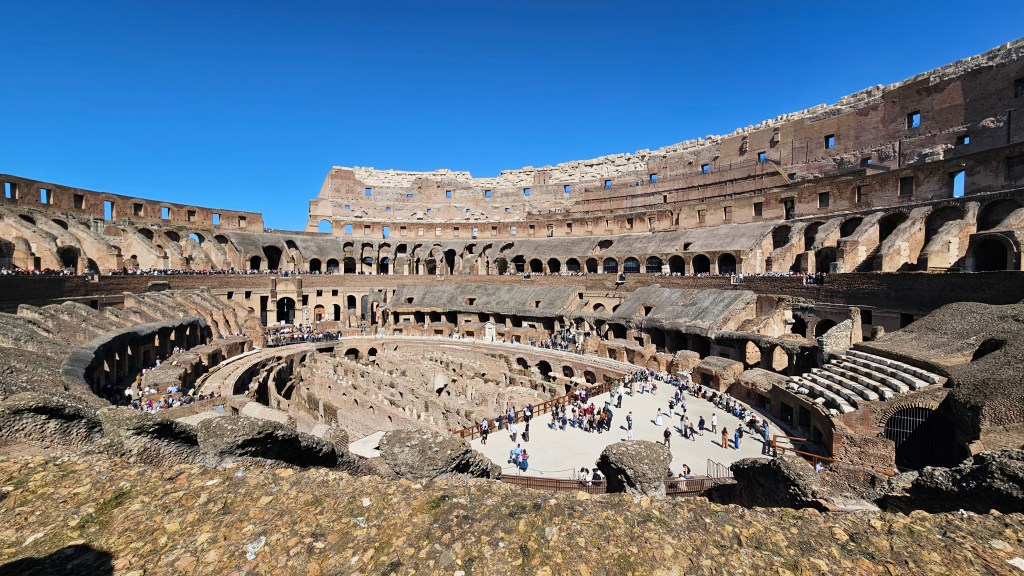 Next morning, we took a bus from Argentina and met up with the tour group assembled in front of Oppio Café where we picked up some sandwiches and cappuccino for our breakfast. The guided tour began at the Roman Forum and then on to Palatine Hill, where Julius Ceasar’s reputed residence was. By the time we reached the Colosseum, school students from different regions of Italy were swarming to apparently beat the summer tourist crowds expected in Rome. Guided tour with earpieces helped us navigate more efficiently. Guide was a local resident and she mentioned that during her high school days, Colosseum entrance didn’t need any tickets and was open to visit for anyone, back in early 2000s! The structure we can see today is remnants of earthquake damage and ravages left by looters after the decline of Roman empire. The overall experience of being in a ~2000-year-old structure that was standing tall and holding hundreds of people left an indelible mark.