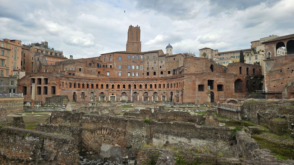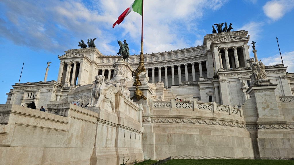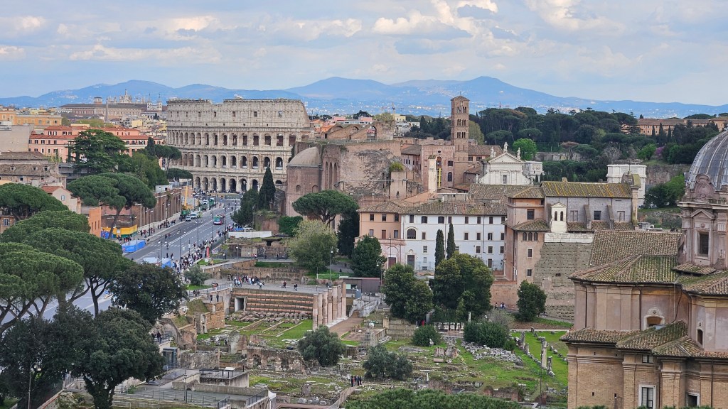 After the tour, we grabbed a pizza at a sit-in-restaurant and a gelato at a nearby gelateria. Then, we just took a relaxing stroll around Imperial Forum before stopping at Piazza Venezia. At its center is Trajan’s column, a 30-m column fully inscribed with more than 2000 figures and several scenes from the wars won by Trajan. Piazza Venezia, a white structure, is a relatively modern structure compared to all the historic structures and remains around the area. Although Mussolini had given several speeches from here, there was no information of that in the two museums we visited inside. There is an elevator by the side of the café at the intermediate level to get to the panoramic view point. Rome in its entirety can be seen from here.